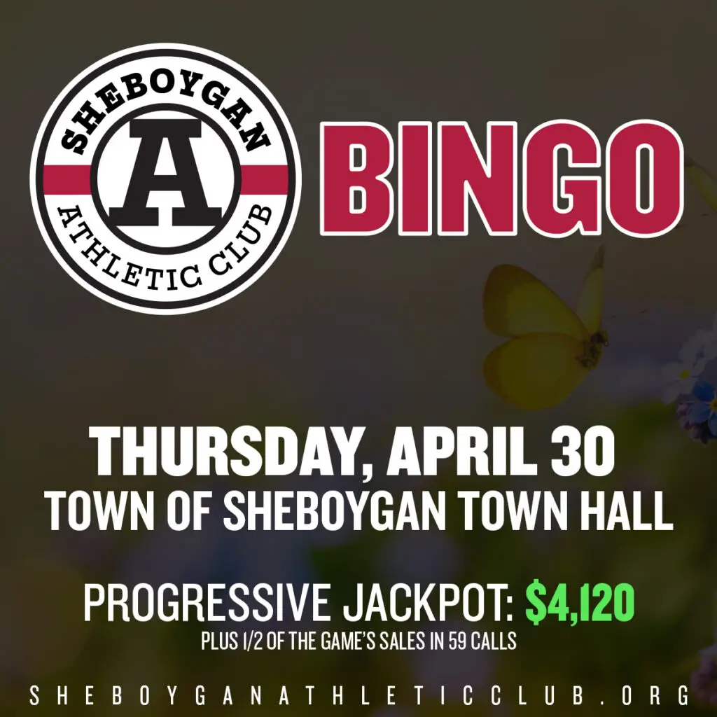 The next Sheboygan Athletic Club Bingo takes place on on Thursday, April 30 at 6:30 PM at the Town of Sheboygan Town Hall.