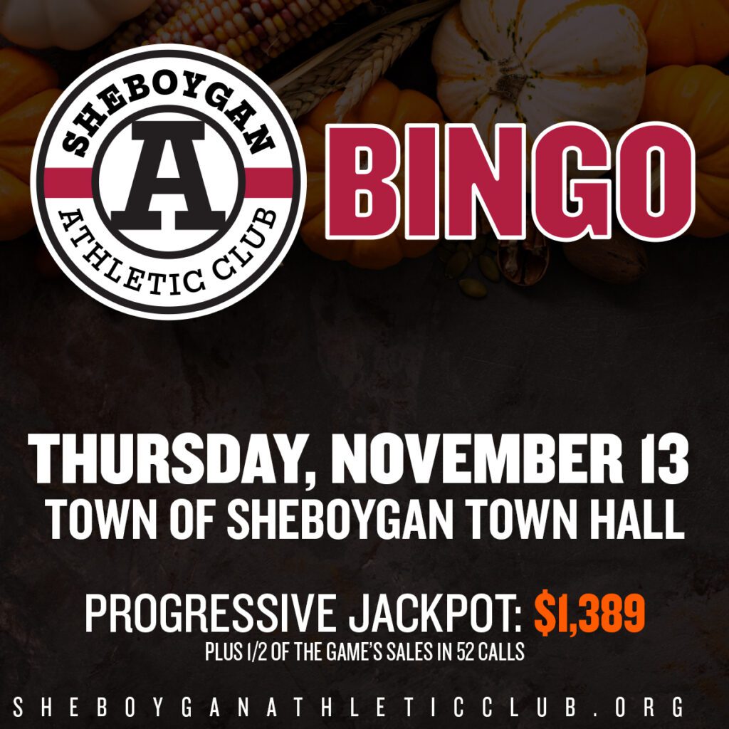 Join us for the next Sheboygan Athletic Club Bingo on Thursday, November 13 at 6:30 PM at the Town of Sheboygan Town Hall.