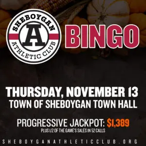 The next Sheboygan Athletic Club Bingo takes place on Thursday, August 10 at 6:30 PM at the Town of Sheboygan Town Hall.