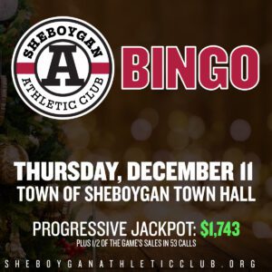 The next Sheboygan Athletic Club Bingo takes place on Thursday, March 13 at 6:30 PM at the Town of Sheboygan Town Hall.