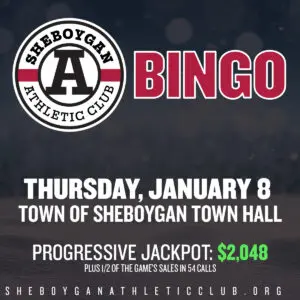 The next Sheboygan Athletic Club Bingo takes place on Thursday, October 31 at 6:30 PM at the Town of Sheboygan Town Hall.